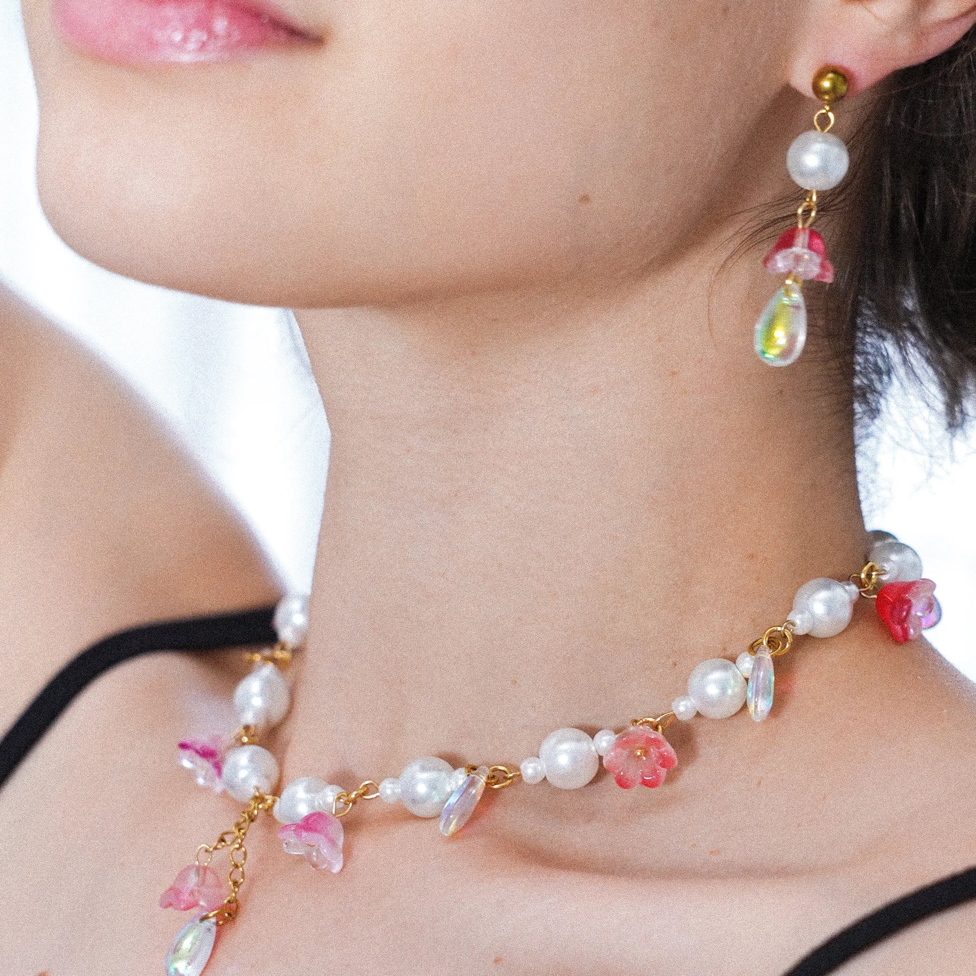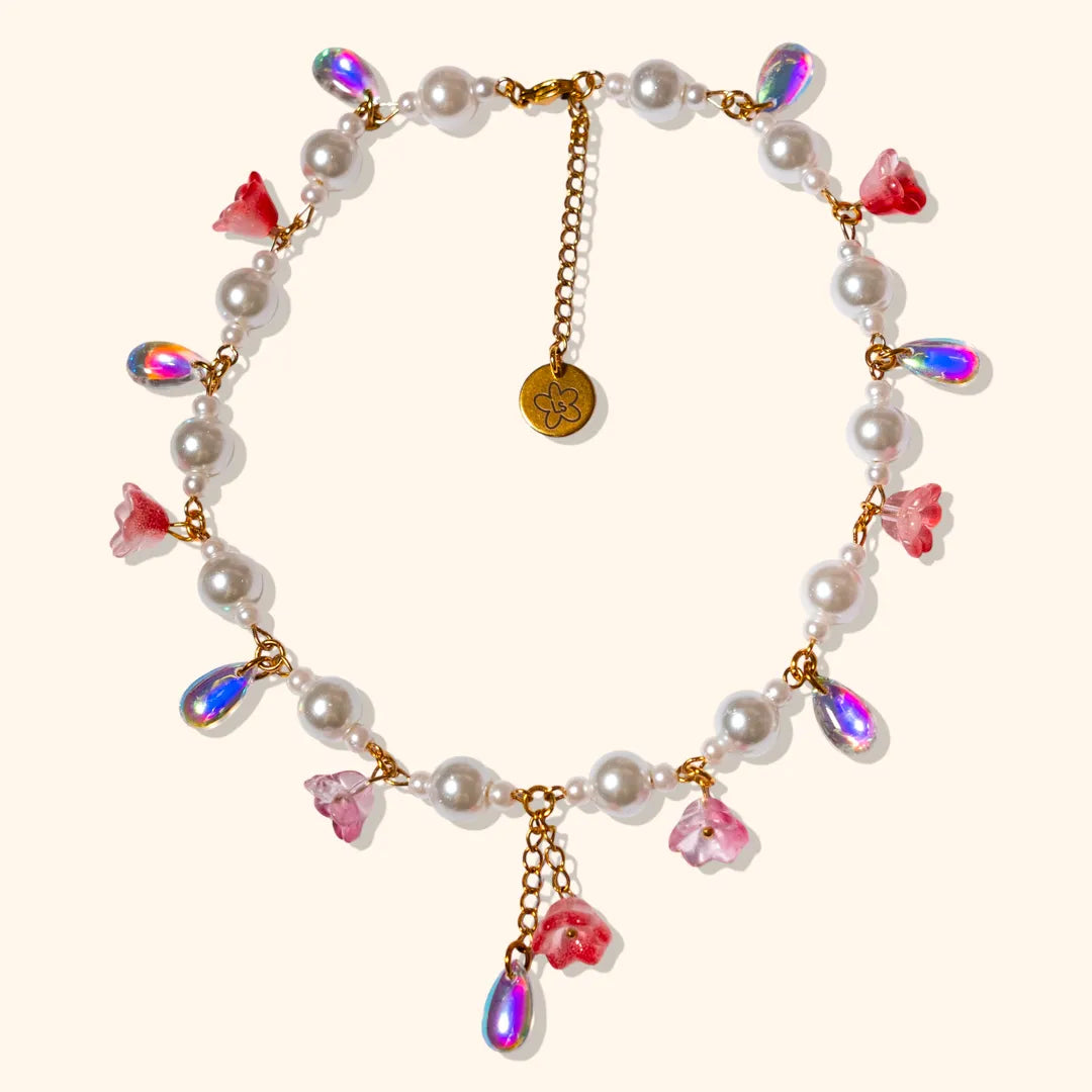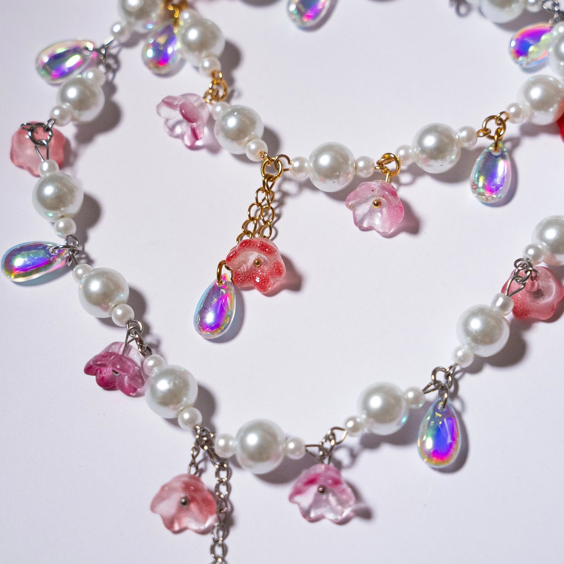 Ce collier Larme, comme chaque bijou de cette collection, est inspiré d'une illustration réalisée par mes soins (non inclue). Ce collier mêle perles nacrées, fleurs en verre entre rose et rouge et gouttes en verre holographique. Ce bijou unique attire tous les regards de part sa forme et ses reflets changeants.