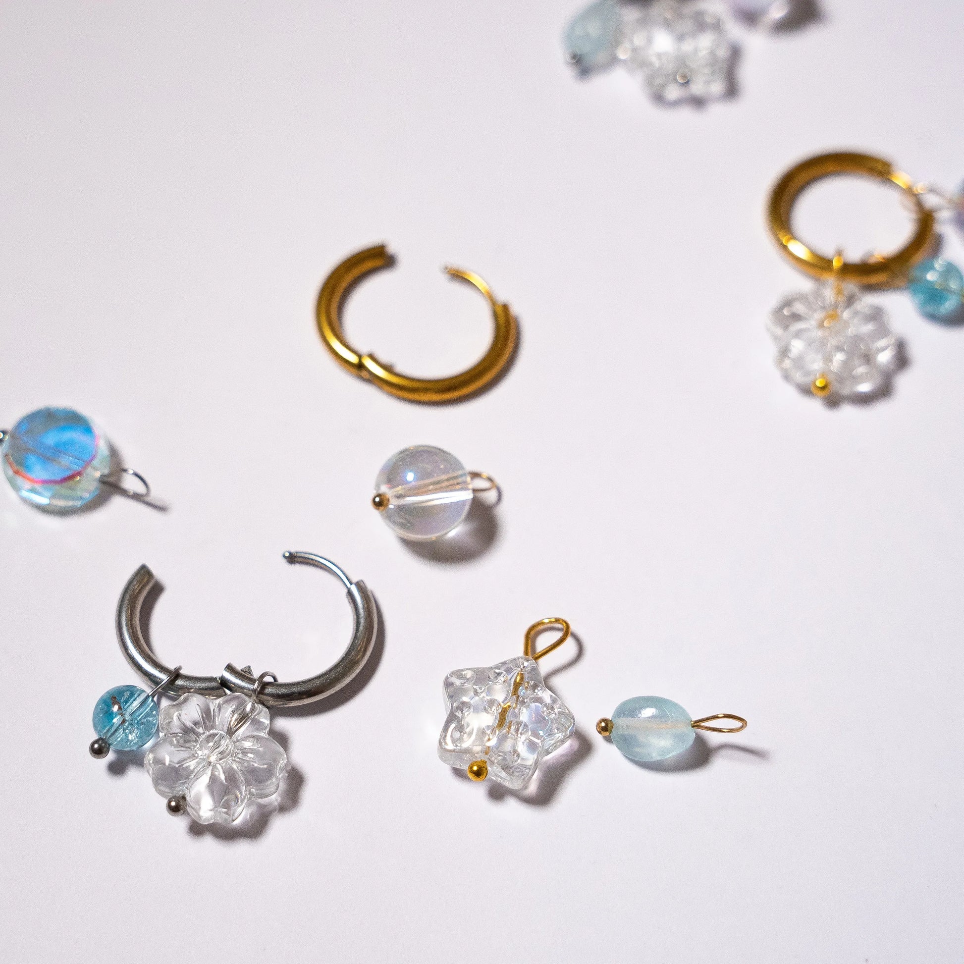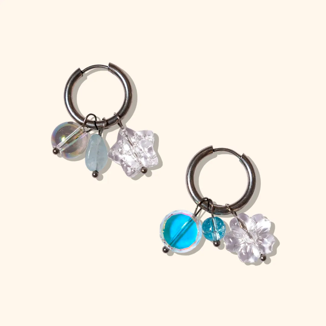 Les boucles d'oreilles Paradoxe osent un jeu audacieux de matières et de formes en dégradé de transparence et de bleu. Leur design versatile permet de retirer, déplacer et replacer les breloques selon les envies.