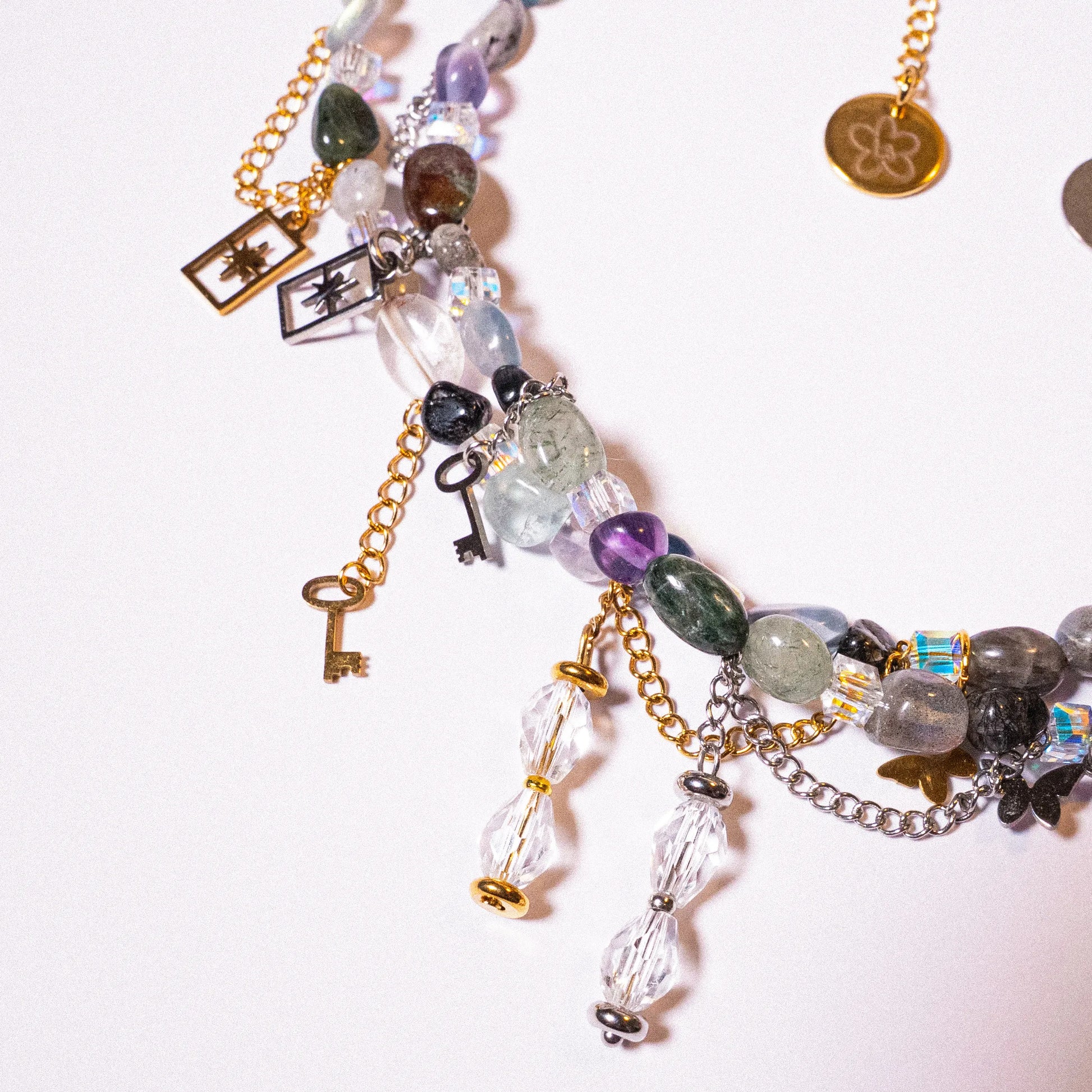 Le collier Fée du Temps est une création raffinée alliant pierres naturelles et cristaux de verre en un design sobre mais complexe. Un bijou à la fois unique et subtil qui symbolise, de toutes ses breloques, le temps qui passe.