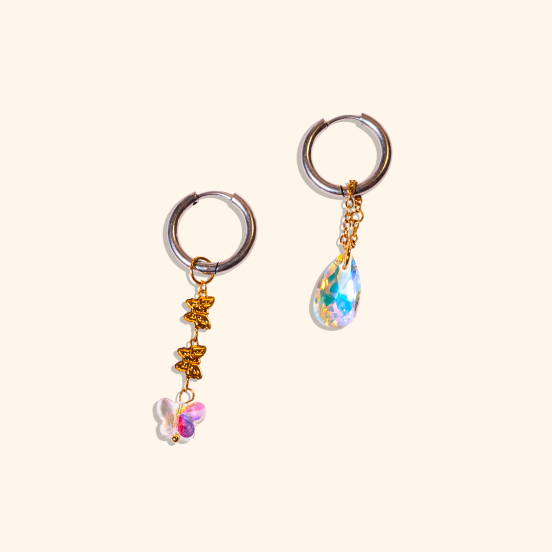 Ces boucles d'oreilles Fée Miroir osent un mélange audacieux de doré et d'argenté. Les perles en verre captent la lumière avec éclat, créant un bijou qui complète parfaitement le collier Fée Miroir assorti et affirme un style audacieux et captivant.