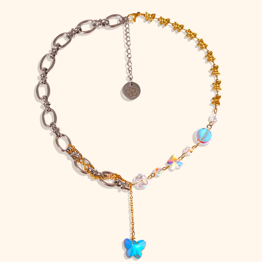 Le collier FĂ©e Miroir ose un contraste audacieux entre argentĂ© et dorĂ© qui capte tous les regards. Ses perles en verre Ă facettes reflĂštent la lumiĂšre avec intensitĂ©, tandis que son design asymĂ©trique et complexe se marie avec les boucles dâoreilles dĂ©pareillĂ©es assorties.