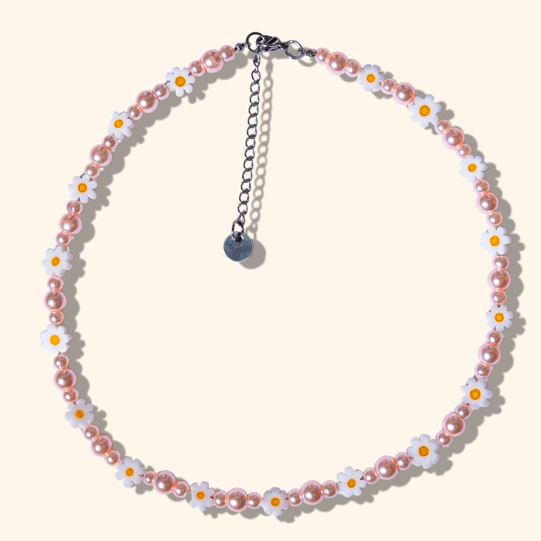 Le collier Marguerite est fait de perles nacrées roses et marguerites en verre. Un bijou acidulé et élégant <3